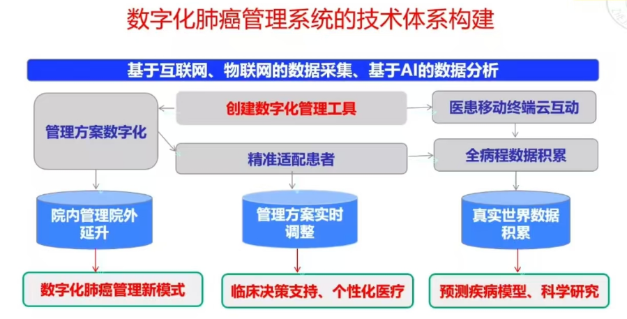 基于以上的理论基础,我们试图探索一种新的数字化肺癌全程管理模式。以下为该模式的技术体系构建,该体系以提高医生的工作效率为核心,助力积累真实世界数据,提高医生肺癌诊治的同质化水平;重视推广慢病治疗新理念,实现多病共管、癌肺同治;强调患者及家属参与,提高患者对疾病的自我管理能力;通过完善疾病管理,减少疾病对社会带来的负担,对于我国医疗保障体系具有积极的影响,符合“新质生产力”的要求。