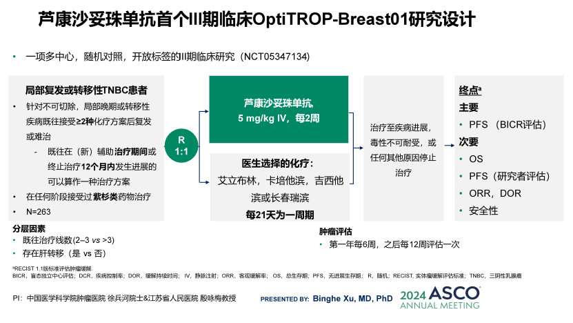 三阴性乳腺癌是一种高侵袭性的亚型,具有发病年龄早、异质性高、恶性程度高、预后差等特点,约占所有乳腺癌的15%,其中超过80%以上的三阴性乳腺癌TROP2(人类滋养层细胞表面抗原2)过表达。单药化疗是当前经治的晚期三阴性乳腺癌最主要的治疗手段,整体疗效欠佳(mPFS:2–3个月,mOS:5–8个月),戈沙妥珠单抗(SG)已经被NCCN指南推荐作为晚期三阴性乳腺癌二线治疗的优选治疗方案。戈沙妥珠单抗是唯一获批的TROP2 ADC,治疗费用对大多数患者来说高不可攀,同时疗效和安全性有进一步提升的空间,因此需要开发新型改良的TROP2 ADCs,为晚期三阴性乳腺癌患者提供更多的治疗选择。OptiTROP-Breast01研究是一项多中心、随机对照、开放标签、III期临床试验(NCT05347134),由中国医学科学院肿瘤医院徐兵河院士和江苏省人民医院殷咏梅教授共同牵头,立足TNBC治疗手段匮乏的临床难点,旨在探索芦康沙妥珠单抗对比单药化疗二线/后线治疗不可手术切除的局部复发或转移性三阴性乳腺癌的疗效和安全性。