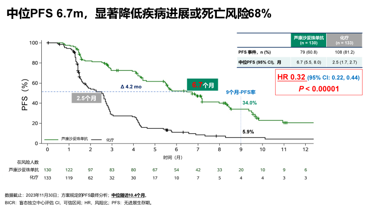 数据截至2023年11月30日(中位随访时间10.4个月),该研究已达到PFS主要终点。根据BICR评估的结果,芦康沙妥珠单抗组和化疗组患者的mPFS分别为6.7个月(95%CI:5.5-8.0)和2.5个月(95%CI:1.7-2.7)。相比化疗,芦康沙妥珠单抗显著降低疾病进展或死亡的风险68%(HR=0.32,95%CI:0.22-0.44,P<0.00001)。