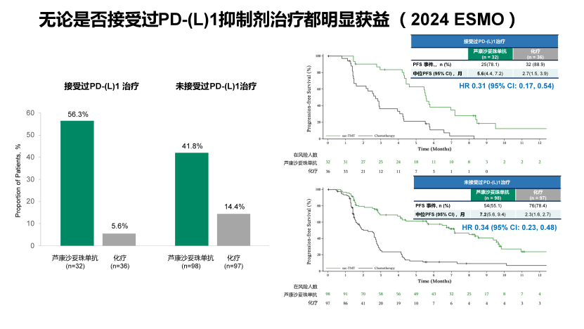 探索性的分析结果显示,无论TROP2表达的情况,无论是否接受过PD-(L)1抑制剂治疗,接受芦康沙妥珠单抗的治疗相较于化疗,都展现出明显的获益趋势(如图5和图6所示)。