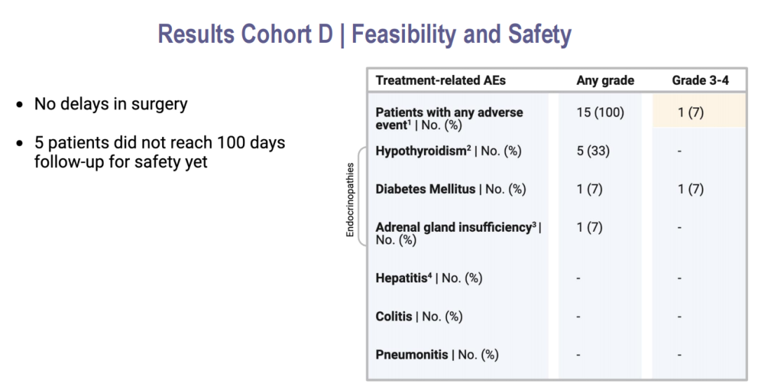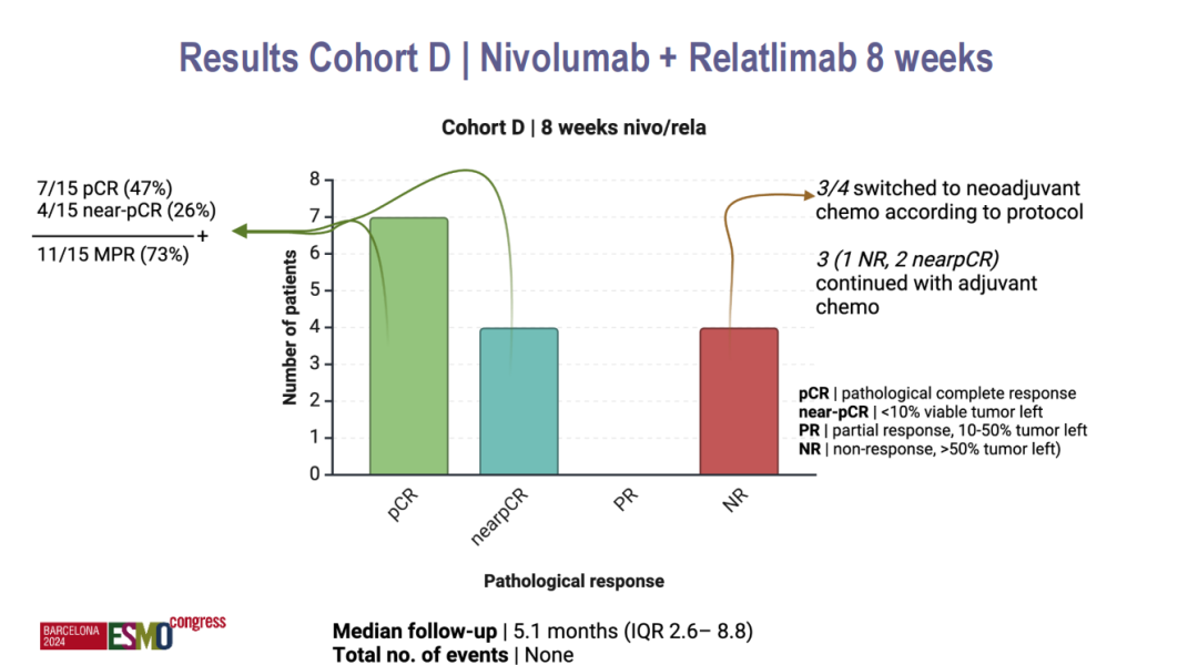 队列D采用nivo/rela双免疫联合治疗的方案,中位随访5.1个月,患者获得了更高的pCR率,47%(7/15)的患者达到了pCR,73%(11/15)的患者达到MPR(肿瘤缩小>90%)。
