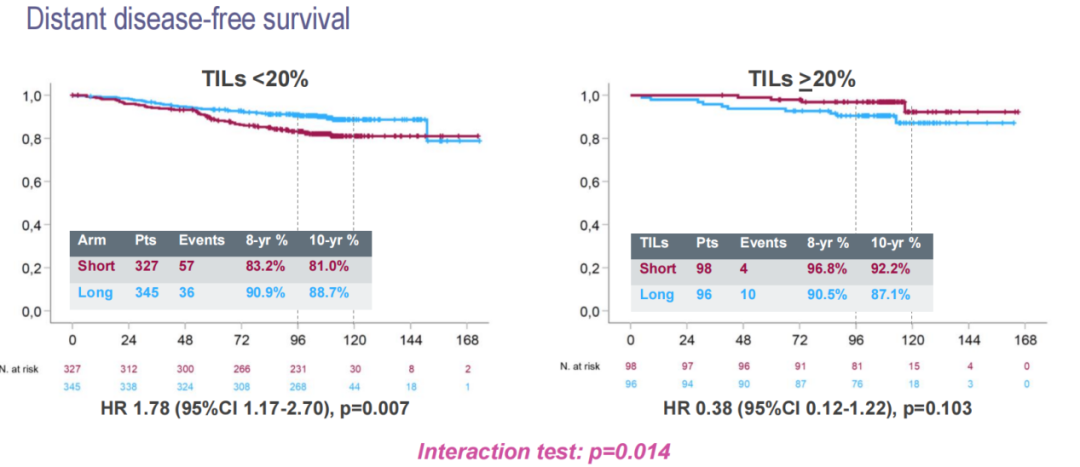 TILs<20%的患者在标准治疗组中相较于短疗程组显示出更好的DDFS(10年DDFS 88.7%vs 81.0%,HR 1.78,95%CI:1.17~2.70,P=0.007),TILs≥20%的患者则显示出相反的结果(10年DDFS 87.1%vs 92.2%,HR 0.38,95%CI:0.12~1.22,P=0.103,交互作用检验P=0.014)。