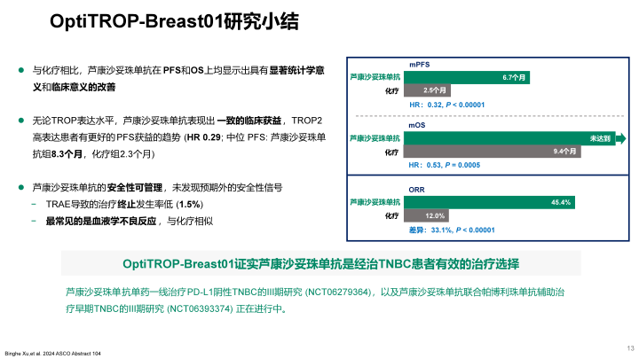 结果显示,BICR评估的mPFS为6.7 vs 2.5个月,HR为0.32(P<0.00001),使TNBC二线及其后治疗的PFS首次超过半年,HR值为历史最低数值,降低了疾病进展或死亡风险68%,具有里程碑式的意义。OS尚不成熟,但已经跨越了预设的疗效界值,HR为0.53(P=0.0005),降低死亡风险47%,显著的改善了患者的生存结局。芦康沙妥珠单抗组客观缓解率(ORR)高达45.4%,是常规单药化疗的4倍,且缓解的患者疾病控制时间更为持久。