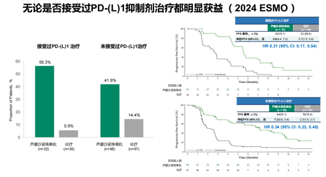 在该研究中,约1/4的患者为免疫检查点抑制剂经治的患者。如今免疫治疗是早期TNBC(新)辅助治疗及晚期一线(PD-L1阳性)的标准治疗策略,而此次ESMO发布的数据提示,芦康沙妥珠单抗相较于单药化疗,无论是否接受过PD-1或PD-L1抑制剂治疗都明显获益,芦康沙妥珠单抗解决了当下临床实践的主要问题和治疗需求。