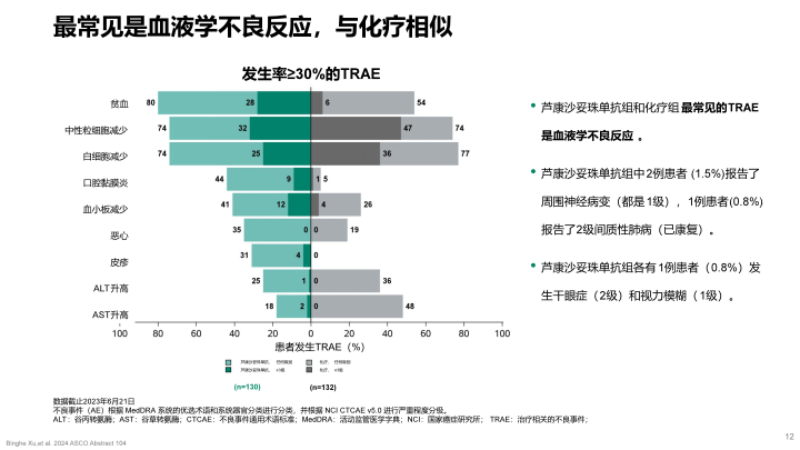 在安全性方面,芦康沙妥珠单抗中位持续治疗15.4周显示整体安全性良好,与单药化疗相似。患者因为治疗相关不良事件(TRAE)导致治疗减量的比例为25.4%、治疗终止的比例仅1.5%。该研究中导致治疗减量最常见的TRAE为贫血(13.8%)和口腔黏膜炎(5.4%)。最常见的TRAE是贫血(≥3级28.0%)、中性粒细胞计数下降(≥3级32.0%)、白细胞计数下降(≥3级25.0%)和口腔粘膜炎(≥3级9%)等。