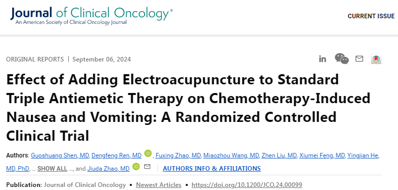 编者按:日前,青海大学附属医院乳腺疾病诊疗中心赵久达教授团队在Journal of Clinical Oncology(JCO)杂志(IF:42.10)发表了最新研究成果,该研究针对乳腺癌患者化疗所致恶心呕吐(CINV),在国内外首次将目前标准三联止吐方案与电针结合,结果显示在标准三联止吐方案基础上增加电针可显著提升CINV的治疗效果。本研究是目前国内肿瘤领域发表的针灸相关课题影响因子最高的文章,也展现了我国学者在国际舞台上的科研实力与创新能力。《肿瘤瞭望》特邀青海大学附属医院赵久达教授对该项研究进行介绍。