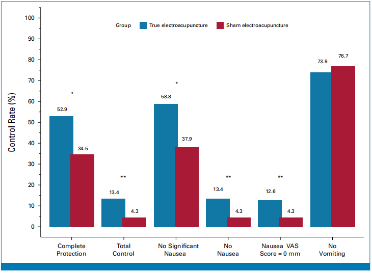 进一步的事后探索性分析显示,电针的主要作用是提高延迟期完全保护率。另外,电针的主要作用是减少延迟期恶心的发生。延迟期恶心较急性期恶心更为常见,且更严重,治疗更为困难。电针疗法在治疗延迟期恶心方面可能更具优势。