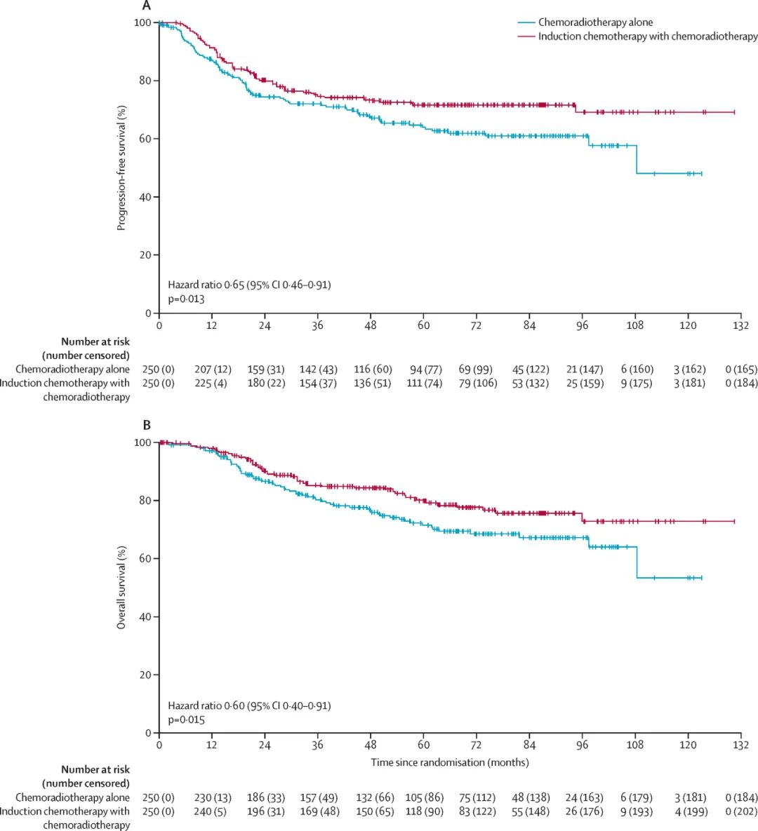 诱导化疗采用每周静脉注射卡铂和紫杉醇,持续6周,然后进行基于顺铂的标准放化疗。主要终点是无进展生存(PFS)和总生存(OS),中位随访时间为67个月。