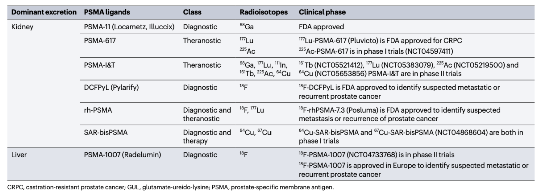 通过放射性标记,PSMA-PET/CT可将PSMA表达可视化。但应注意,PSMA假阳性可能出现于软组织病变、异常血管增生、创伤或胸腺瘤等。此外,良性前列腺病变中的PSMA,特别是良性前列腺增生和前列腺上皮内瘤变,需要进一步分析。而通过对PSMA-PET/CT成像进行仔细分析,可提高诊断精度。同时,目前也正在开发多种PSMA放射性配体疗法,如表1所示。