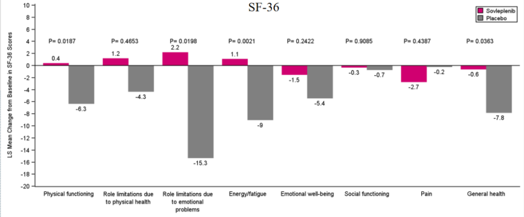 在生活质量情况方面,基于SF-36量表的评估,与基线相比,索乐匹尼布组患者的躯体功能、因情绪问题导致的角色限制、体能/疲劳状况、总体健康、因躯体健康导致的角色限制、情绪健康和社会功能等方面的评分均有所改善,显示索乐匹尼布治疗对患者的日常生活和心理状态产生了一定积极影响,有望帮助提升患者的社会参与度。