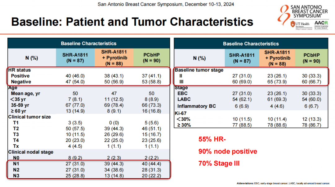 在SHR-A1811的研究中,我们特意筛选了肿瘤负荷较大的患者,以更准确地评估其抗肿瘤活性。结果显示,SHR-A1811单药组的pCR率达到了63%,与标准的四药联合方案相当,这超出了我们的预期。特别是在基线90%淋巴结阳性、70%临床分期为III期的患者中,SHR-A1811表现出了非常显著的治疗效果。