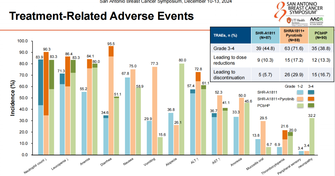 李俊杰教授:在选择治疗方案时,我们总是希望找到疗效与安全性之间的最佳平衡。SHR-A1811在保持高效疗效的同时,相比标准治疗PCbHP,在某些不良反应如脱发、腹泻、外周神经病变以及中性粒细胞减少等方面,发生率更低。这为我们提供了一个更安全的治疗选择。