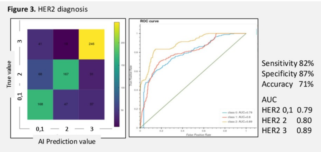 HER2:基于3272个训练数据和818个测试数据,敏感性为82%,特异性为87%,准确性为71%,HER2评分为0的AUC为0.79,HER2评分为2的AUC为10.80,HER2评分为3的AUC为0.89。在低评分情况下,诊断准确性略低(图3)。
