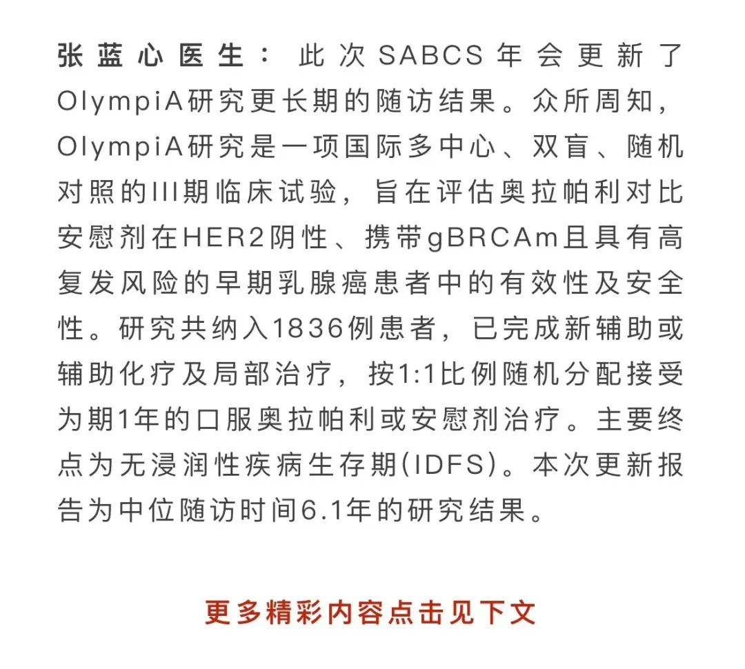 [2].Judy Garber,et al.OlympiA:A phase 3,Multicenter,Randomized,Placebo-Controlled Trial of Adjuvant Olaparib after(Neo)Adjuvant Chemotherapy in Patients w/Germline BRCA1&BRCA2 Pathogenic Variants&High-Risk HER2-Negative Primary Breast Cancer:Longer Term Follow.2024 SABCS GS1-09.