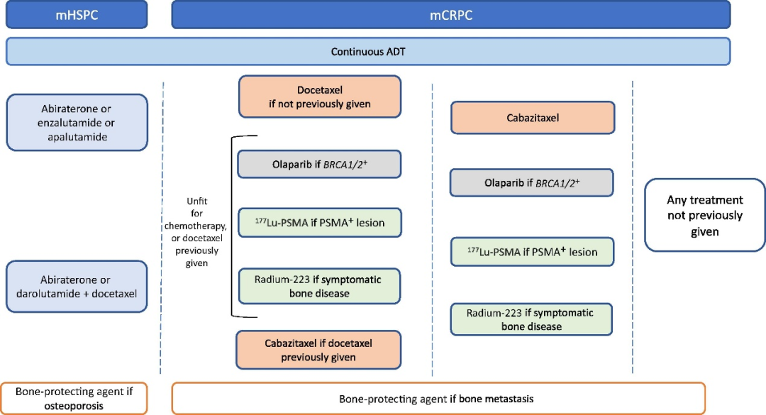 晚期转移性前列腺癌是一种异质性疾病,目前ADT联合ARPI疗法是主要治疗方法。在ARPI治疗后,可依次使用所有可用的后续疗法。然而,患者选择成为关键。目前尚未满足的需求是确定临床或分子预测因素,以协助临床医生选择合适的全身治疗顺序。