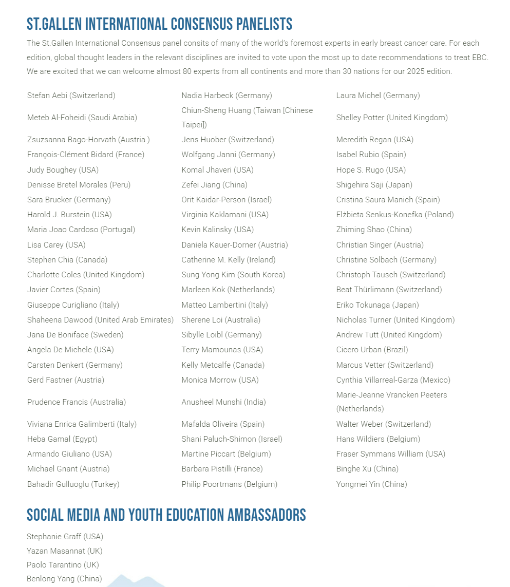 2025年St.Gallen早期乳腺癌国际专家共识投票小组成员名单