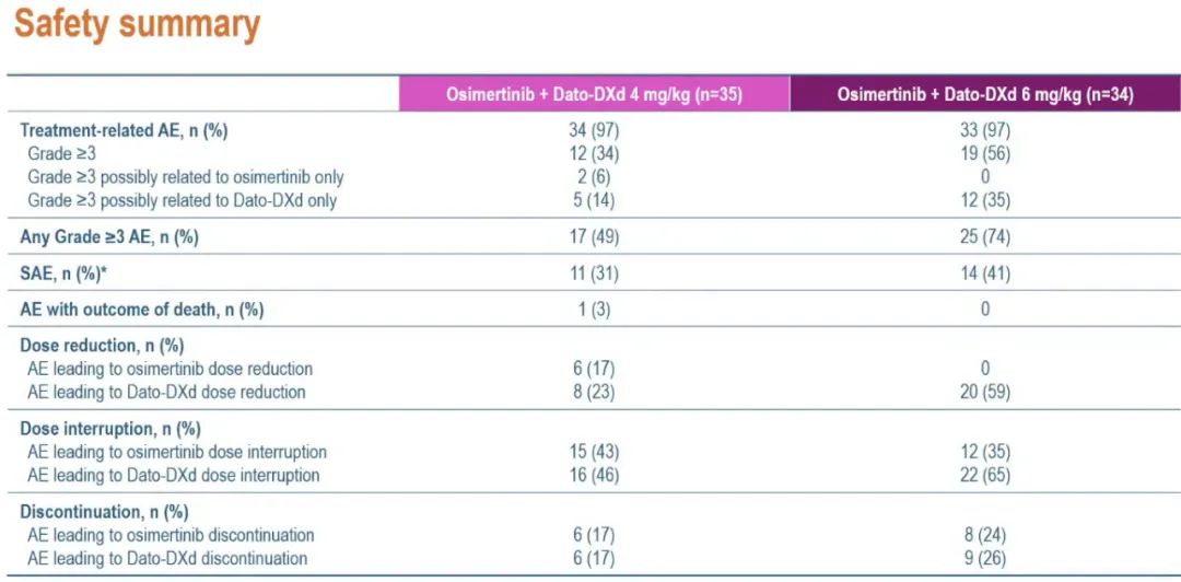 69例患者接受了奥希替尼联合Dato-DXd治疗。4mg队列(n=35)和6mg队列(n=34)的中位治疗持续时间分别为9.0个月和9.8个月;中位随访时间分别为13.4个月和13.8个月。