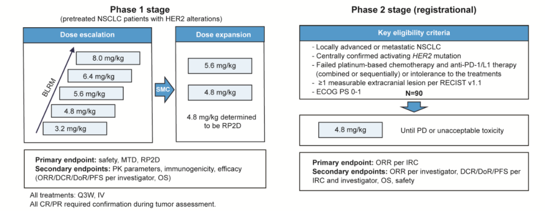 此外,HER2变异的另外两种类型HER2扩增与HER2过表达不同于HER2突变,同样是患者预后较差的因素,HER2扩增人群占NSCLC比例约为2.4%~20%[13,15],HER2过表达约占6%~35%[14],这两类患者同样有着非常大的临床需求,所以我们也在开展一项Ⅱ期研究,旨在探索瑞康曲妥珠单抗单药或联合免疫治疗在这部分人群中的潜在价值。