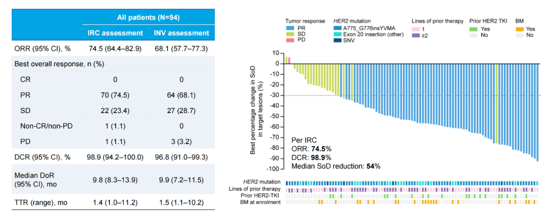 陆舜教授:非常开心能在AACR大会中与全球的同仁们分享HORIZON-Lung研究的最新成果,瑞康曲妥珠单抗(SHR-A1811)治疗既往经治的HER2突变晚期或转移性NSCLC中位随访时间达到14.2个月,IRC评估的ORR达到了74.5%,较柳叶刀肿瘤学期刊中报道的既往数据73.4%进一步提升,且刷新了全球同类研究的记录[1,2]。这一结果坚实地奠定了瑞康曲妥珠单抗作为HER2突变患者后线治疗的首选地位。亚组分析显示基线脑转移的患者,ORR高达87.5%,为脑转移患者带来了强效缓解的新选择;既往经过抗HER2酪氨酸激酶抑制剂(TKI)治疗的患者同样取得令人欣喜的结果,ORR达到81.8%,提示抗HER2 TKI治疗后的患者仍能从瑞康曲妥珠单抗治疗中获益,使得临床治疗过程中有着更加丰富的选择。中位至缓解时间(TTR)仅为1.4个月,中位的靶病灶直径总和(SoD)退缩率达到了54%,显示出瑞康曲妥珠单抗快速缩瘤起效的特性[1]。