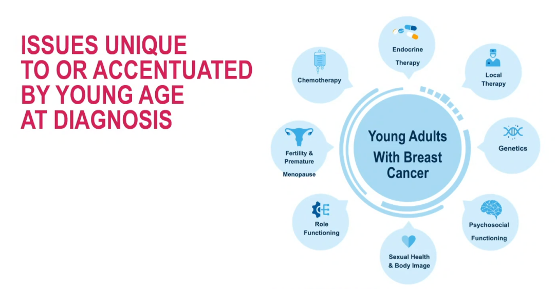 尽管近年来在乳腺癌的早期发现和治疗方面取得了重大进展,但年轻乳腺癌患者的预后仍然比许多老年患者差(Breast.2022;61:77-83)。由于这些女性正处于生育年龄、家庭生活和事业发展的黄金时期,因此关键问题涉及生育能力与生育规划、遗传学、身体形象以及性健康。年轻患者的治疗选择往往比老年患者更具挑战性,因为年轻患者通常罹患侵袭性较强的疾病,需要强化治疗。