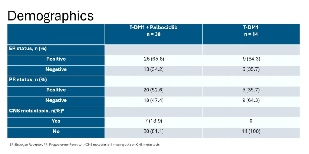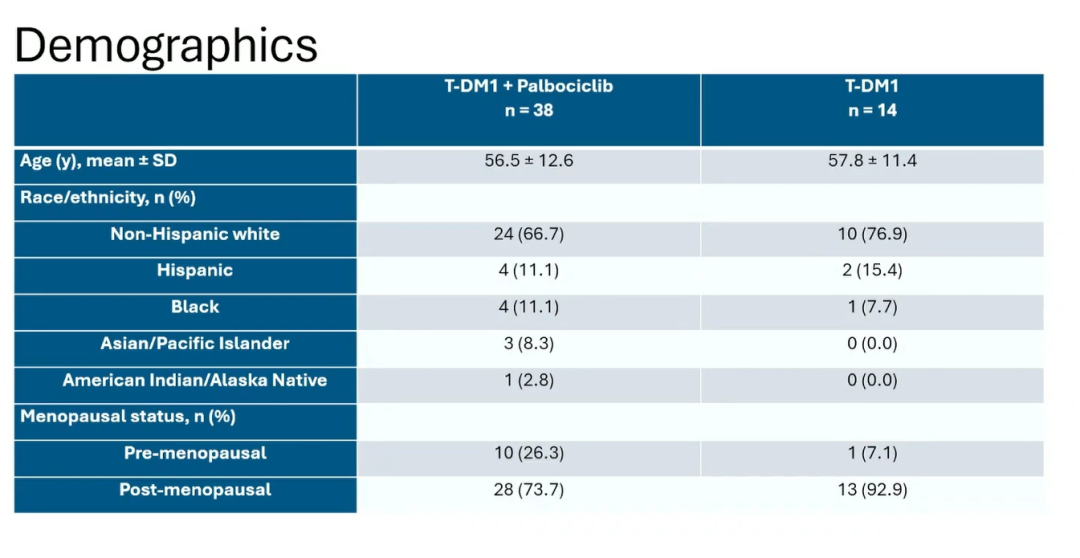 研究共纳入52例患者,其中T-DM1单药组14例,T-DM1+哌柏西利组38例。单药组和联合组的中位年龄分别为57.8岁和56.5岁。