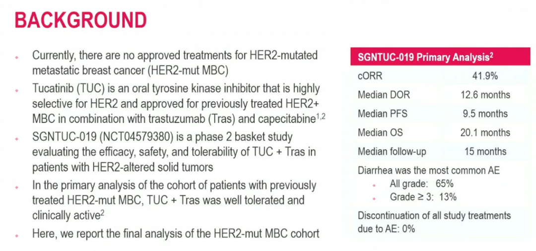 目前,针对HER2突变转移性乳腺癌(HER2-mut MBC)尚无获批的治疗方案。图卡替尼是一种高选择性口服HER2酪氨酸激酶抑制剂,已获批联合曲妥珠单抗和卡培他滨治疗既往经治的HER2阳性MBC患者。SGNTUC-019(NCT04579380)是一项II期篮子研究,旨在评估图卡替尼联合曲妥珠单抗在携带HER2-突变的实体瘤患者中的疗效、安全性及耐受性。在针对既往经治HER2-mut MBC队列的初步分析中,该方案表现出良好的耐受性和临床活性(确认的客观缓解率[cORR]为41.9%;中位缓解持续时间[mDOR]为12.6个月;中位无进展生存期[mPFS]为9.5个月;中位总生存期[mOS]为20.1个月)(Okines et al.,Nat Med.2025)。本文报告该队列的最终分析结果。