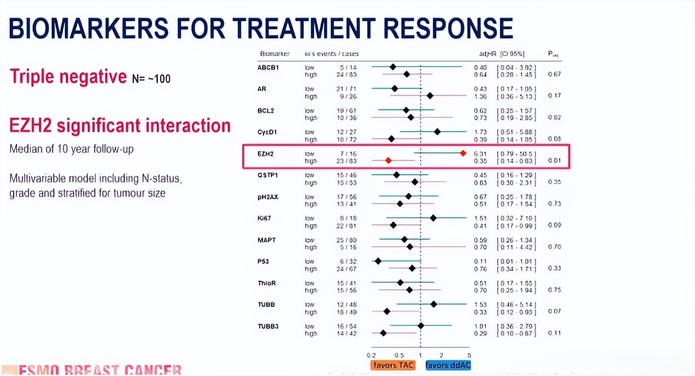 研究结论:三阴性乳腺癌患者中,EZH2低表达者更可能从ddAC方案获益,而EZH2高表达者接受TAC方案预后更佳。校正sTILs后,高微管蛋白表达可能提示多西他赛治疗获益。需开展更大样本量的研究以明确这些生物标志物的临床应用价值。