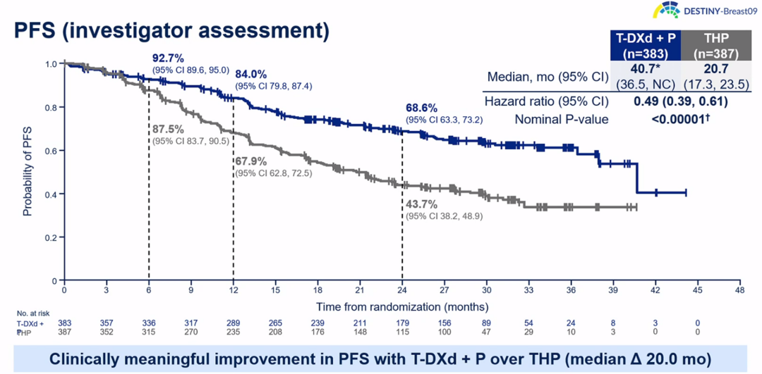 纵览乳腺癌抗HER2治疗发展史,从单靶治疗发展到双靶治疗,而双靶治疗已经有十几年的历史,并且成为非常经典且重要的治疗方式。而如今,这一“经典”可能面临改变,大家都十分关注T-DXd联合帕妥珠单抗(T-DXd+P)或者单独使用T-DXd,能否超越现有的标准一线治疗THP方案(紫杉+曲妥珠单抗+帕妥珠单抗)。根据目前的随访结果,DB-09研究达到了主要研究终点,盲态独立评审中心(BIRC)评估T-DXd+P的中位PFS显著长于THP(40.7 vs 26.9个月;HR 0.56,95%CI:0.44~0.71,P<0.00001)。