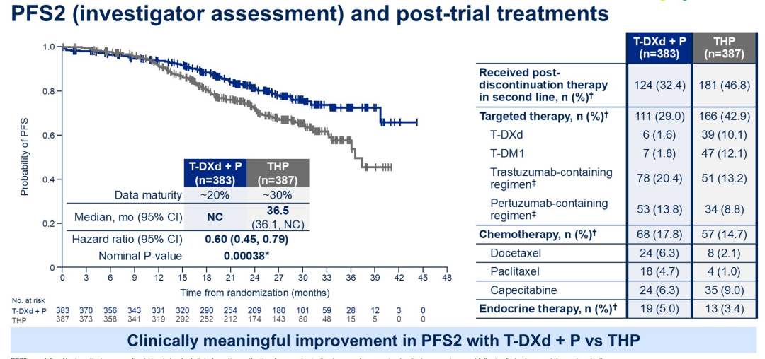 此外,本研究中有超过50%的患者属于三阳性乳腺癌人群,亚组分析显示HR+患者(HR 0.61)和HR-患者(HR 0.52)接受T-DXd+P治疗有一致的PFS获益。2024年SABCS大会报道的PATINA研究,已经改变了一些医生的用药习惯。此类晚期患者接受6至8个周期的THP诱导治疗达到无疾病进展,可在HP+ET基础上联合CDK4/6i进行维持治疗,该研究试验组的中位PFS长达44.3个月,相较于对照组延长了15.2个月(HR 0.74;95%CI:0.58-0.94;P=0.0074)。当然,PATINA研究的维持治疗模式是有前提条件的,即诱导化疗达到CR/PR/SD的患者才能使用。