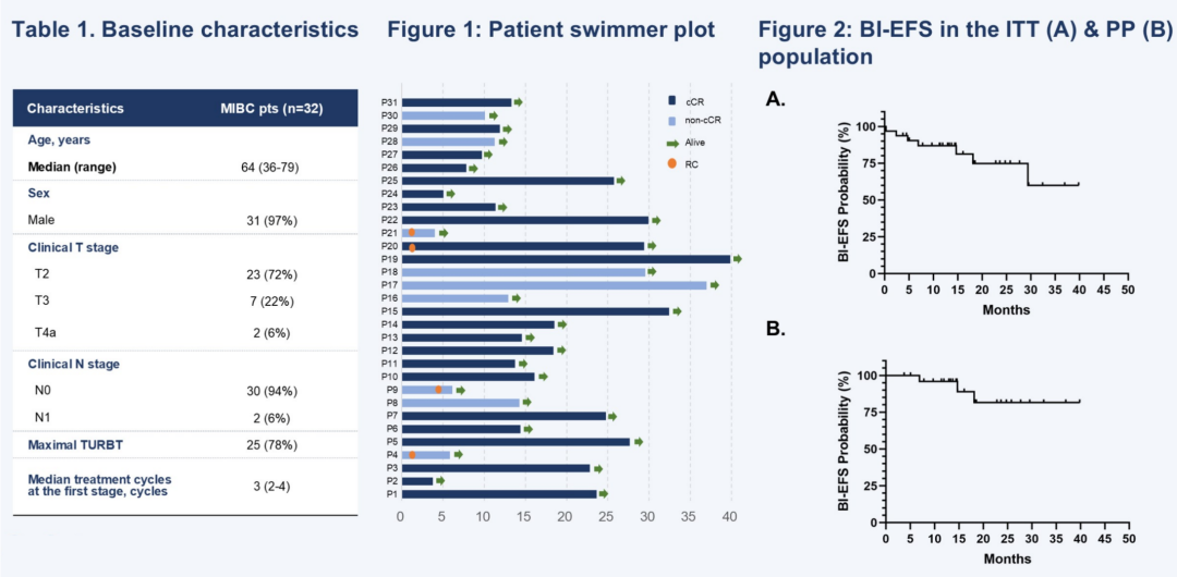 截至2025年1月16日(中位随访时间:14.3个月),共纳入32名患者,中位年龄64岁(年龄范围36-79岁)(cT2:71.8%;cT3:21.9%;cT4:6.3%;cN1:6.3%)。1例患者撤销知情同意,未进行疗效评估。在ITT人群中,71.0%的患者达到cCR,29.0%的患者未达cCR,4例患者接受了根治性膀胱切除术。ITT人群的1年BI-EFS率为86.9%(95%CI,68.8-94.9),PP人群为95.8%(95%CI,73.9-99.4)。在PP人群中,cCR患者和非cCR患者的一年BI-EFS率分别为100%和80%。总体而言,5例患者出现T1高级别复发。同时,3例患者发生远处转移(骨转移3例,远处淋巴结转移2例)。78.1%的患者出现任何级别的治疗相关不良事件(TRAEs),42.3%的患者经历3-4级TRAEs,未发现新的安全性信号。