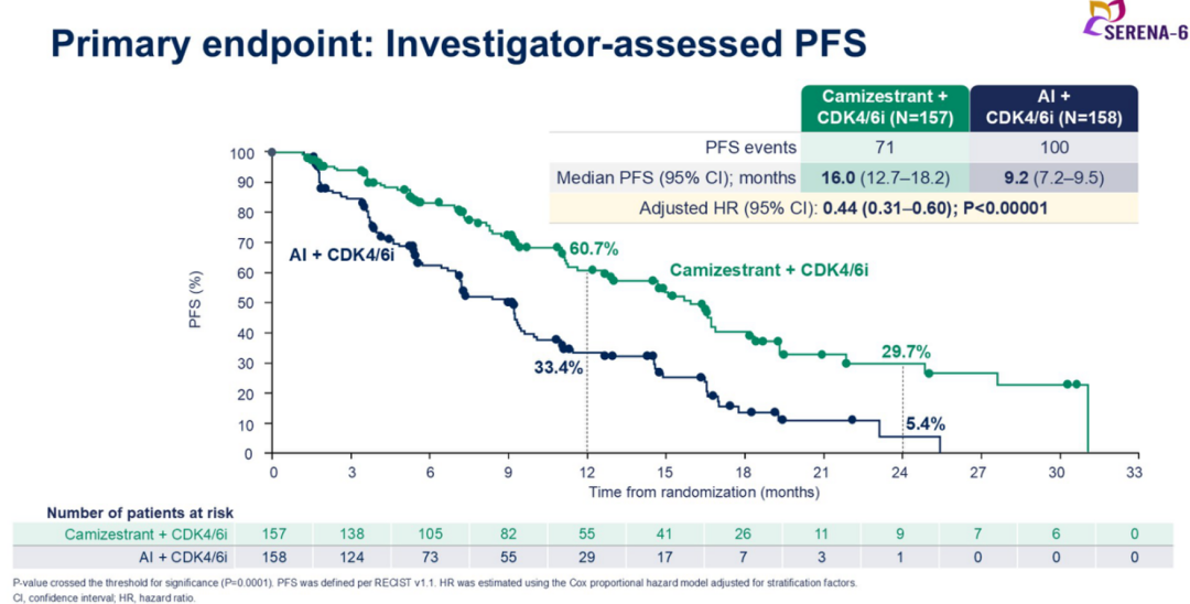 本届ASCO大会上公布的SERENA-6研究进一步验证了这一新模式。该研究入组了接受AI+CDK4/6i(阿贝西利/哌柏西利/瑞波西利)一线治疗≥6个月的HR+/HER2-晚期乳腺癌患者,每2-3个月用ctDNA检测ESR1突变,并同步进行常规影像检查。检测到ESR1突变但无疾病进展的患者按1:1比例随机分为两组,一组患者接受Camizestrant+CDK4/6抑制剂(类型和剂量保持不变)+安慰剂治疗,另外一组患者继续使用AI+CDK4/6抑制剂+安慰剂治疗。