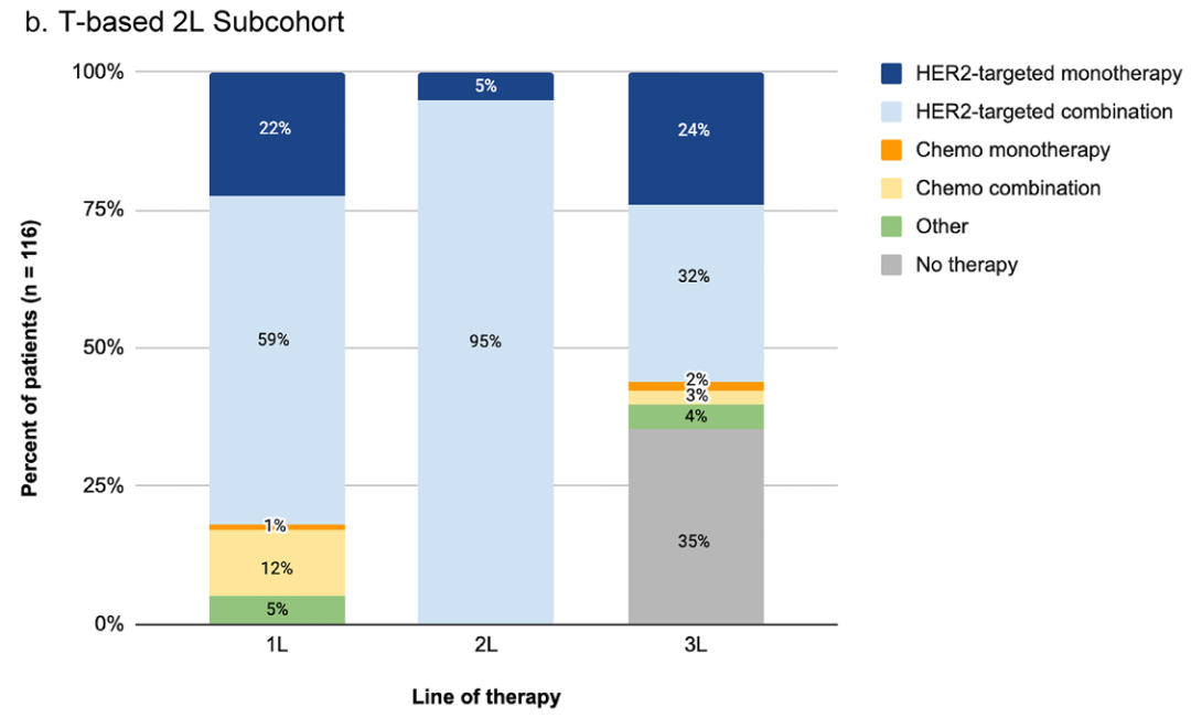 在1线治疗中,87%的所有患者以及82%的基于曲妥珠单抗的2线治疗亚组患者接受了HER2靶向治疗。大多数患者接受了基于曲妥珠单抗的治疗方案(所有患者中的比例为78%;基于曲妥珠单抗的2线亚组比例为68%)。在所有患者中,1线最常见的3种治疗方案依次为曲妥珠单抗+帕妥珠单抗+紫杉烷(40%),曲妥珠单抗+帕妥珠单抗+紫杉烷+卡铂(11%),曲妥珠单抗单药治疗(10%)。一半患者(52%)接受了一线标准治疗,包括紫杉烷+曲妥珠单抗+帕妥珠单抗(THP)联合或不联合其他药物。对于基于曲妥珠单抗的二线治疗亚组,一线治疗的最常见方案分别是曲妥珠单抗+帕妥珠单抗+紫杉烷(28%)、曲妥珠单抗单药治疗(14%)以及T-DM1(9%)。在一线方案中,7%的患者接受了T-DM1治疗;在HER2靶向单药治疗组的比例为15/51;在HER2靶向联合治疗组的比例为7/222。