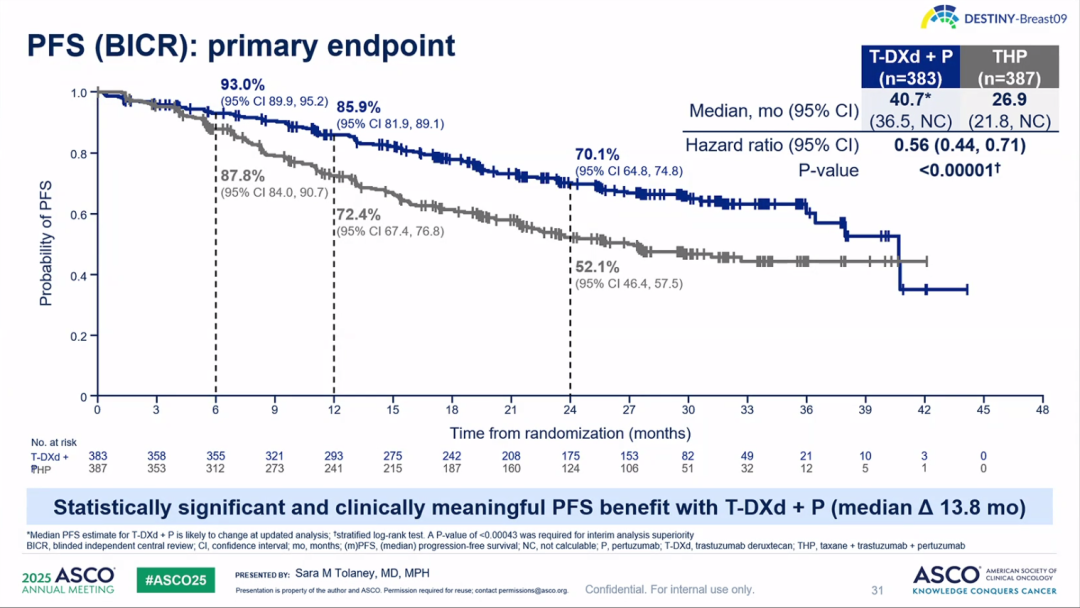 刘健教授:在DESTINY-Breast09研究中,T-DXd+P一线治疗取得了40.7个月的mPFS,意味着患者将会有更加充裕的生存时间迎接更多新型药物的问世,将有更大的机会实现更长的生存期。