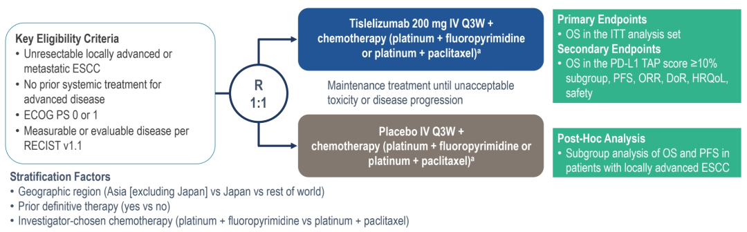 RATIONALE-306研究(NCT03783442)为随机、双盲、全球多中心III期研究(图1),患者入组标准为:不可切除局部晚期或转移性ESCC、未接受过晚期阶段系统治疗、ECOG体力评分0-1分、RECIST v1.1标准下存在可测量/可评价病灶。按1:1分组,干预组接受替雷利珠单抗(200mg IV Q3W)联合化疗,对照组接受安慰剂(IV Q3W)联合化疗,持续治疗至不可耐受毒性或疾病进展。主要终点为意向治疗(ITT)人群总生存期(OS),次要终点包括PD-L1 TAP≥10%亚组OS、无进展生存期(PFS)、客观缓解率(ORR)、缓解持续时间(DoR)、生活质量(HRQoL)及安全性;事后分析(Post-hoc)特别针对局部晚期ESCC亚组进行OS/PFS评估。