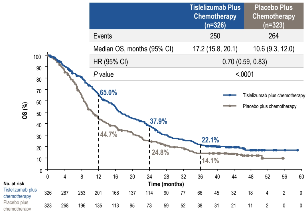 本次亚组分析证实,对于局部晚期ESCC患者,一线替雷利珠单抗联合化疗可显著改善生存结局,结果与该研究ITT人群3年随访结论一致。在局部晚期ESCC患者中观察到生存期显著延长(mOS 25.6月vs 13.3月;HR=0.49),其中PD-L1 TAP≥5%人群获益更显著(mOS 26.4个月vs11.5个月;HR=0.37),安全性特征与整体人群类似且无新风险信号。这些证据有力支持该方案作为局部晚期不可切除ESCC的一线治疗新标准,并为此类患者带来了迅速、持久的生存获益。