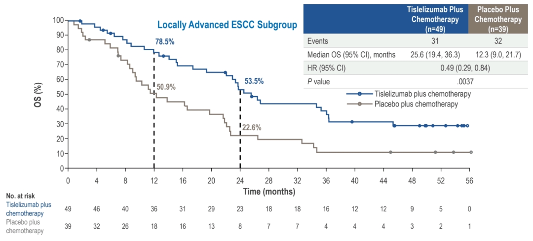 在局部晚期ESCC亚组中,替雷利珠单抗联合化疗组相比安慰剂联合化疗组显著延长mOS,为25.6个月vs 13.3个月,HR:0.49(95%CI 0.29-0.84;P=0.0037);12个月OS率分别为78.5%和50.9%,24个月OS率分别为53.5%和22.6%,免疫联合化疗组生存曲线早期分离,长期维持生存平台期,提示了持续获益(图4)。