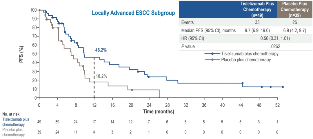 在局部晚期ESCC亚组中,替雷利珠单抗联合化疗组较安慰剂组显著延长mPFS,为9.7个月vs 6.9个月,HR:0.56(95%CI 0.31-1.01;P=0.0262),12个月PFS率提升28%(46.2%vs 18.2%),证实免疫联合化疗对延缓局部晚期疾病进展的显著优势,该获益趋势与OS结果一致(图6)。