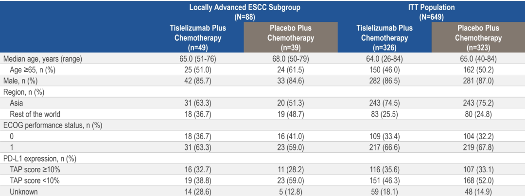 此次ESMO GI披露了该研究的局部晚期ESCC亚组结构。该人群基线人口统计学特征(年龄、性别分布)及疾病特征(ECOG评分、PD-L1表达水平)与总体ITT人群基本一致(图3)。