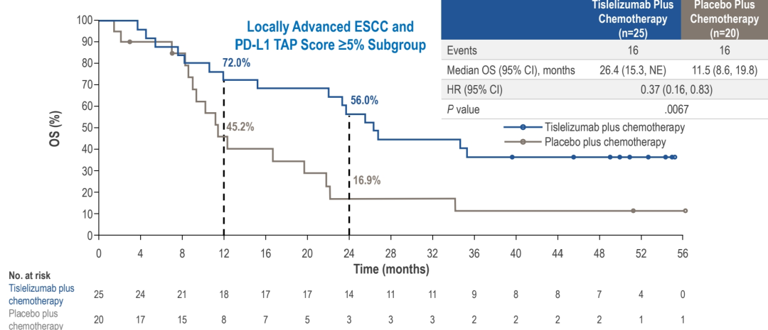 在PD-L1 TAP≥5%的局部晚期ESCC患者中,替雷利珠单抗联合化疗组较安慰剂组实现显著生存获益,mOS为26.4个月vs11.5个月,HR:0.37(95%CI:0.16-0.83,P=0.0067),12个月OS率达72.0%vs 45.2%,24个月时OS率为56.0%vs 16.9%(图5)。