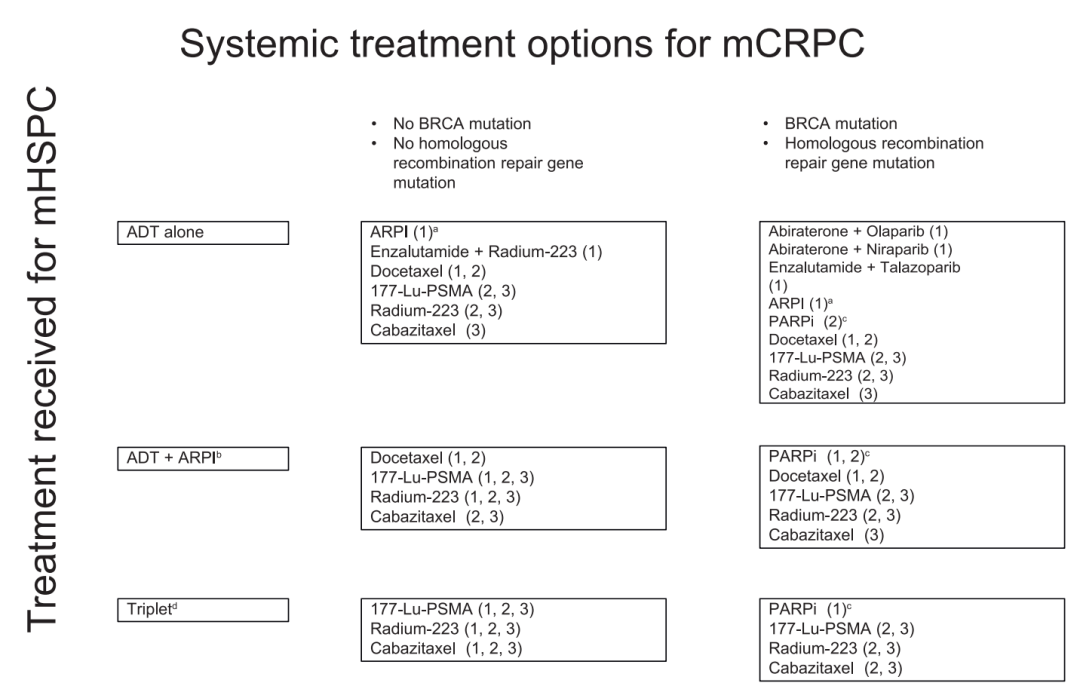 选择转移性CRPC(mCRPC)的最佳系统治疗方案取决于多种因素:年龄、体能状态、疾病负荷、初诊或转移性疾病既往治疗史、DNA修复缺陷的存在以及疾病的PSMA表达。即使在去势抵抗阶段,ADT也应终身维持,因为AR信号对前列腺癌细胞的生存和增殖仍有关键作用。