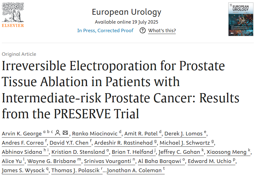 George A K,Miocinovic R,Patel A R,et al.Irreversible Electroporation for Prostate Tissue Ablation in Patients with Intermediate-risk Prostate Cancer:Results from the PRESERVE Trial[J].European Urology,2025.