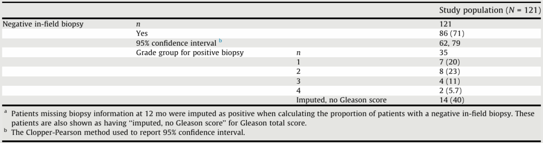 12个月时术区外的活检阴性率为64%。在40例术前活检阳性的患者中,50%为GG1,33%为GG2,13%为GG3,2.5%为GG4,另有2.5%未知。12个月时,前列腺癌发生率为45%(49/110);26%(29/110)的患者在任意部位观察到有临床意义的前列腺癌。