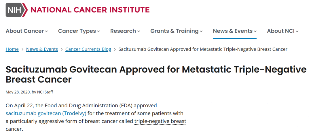 美国国家癌症研究所:FDA加速批准戈沙妥珠单抗治疗TNBC[2]