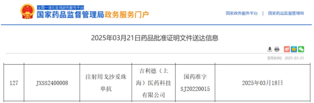 [11]国家药品监督管理局政务服务门户.2025年03月21日药品批准证明文件送达信息.Available at:https://www.nmpa.gov.cn/zwfw/sdxx/sdxxyp/yppjfb/20250321152845131.html