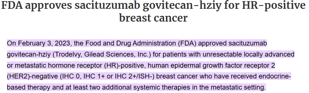 FDA批准戈沙妥珠单抗HR+乳腺癌相关适应症[7]