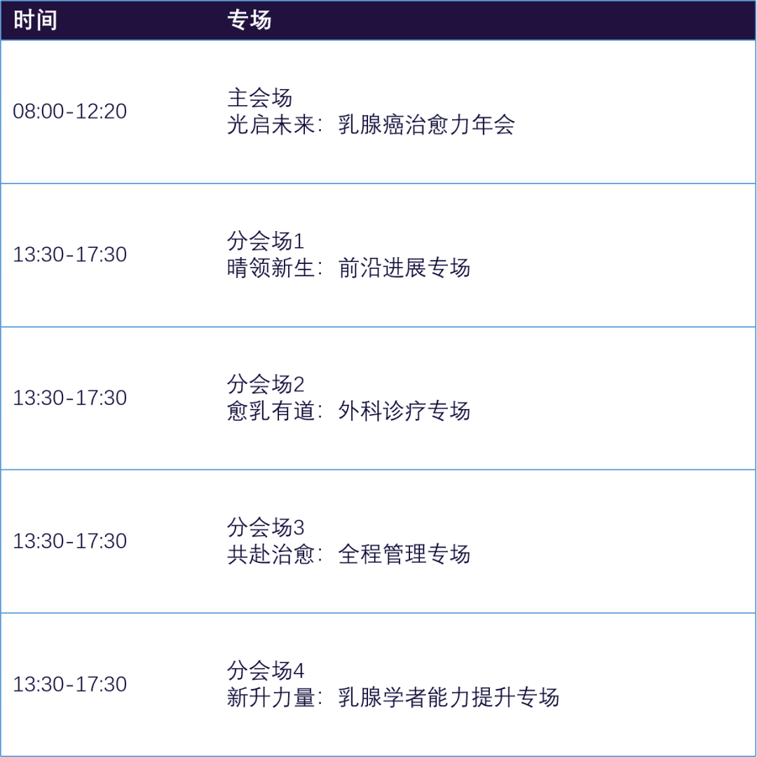 我们不仅在主会场“光启未来”中,集结国内顶尖专家,探讨精准医疗、创新药物、多组学技术等前沿方向,更精心设置了四大分会场:“晴领新生:前沿进展专场”、“愈乳有道:外科诊疗专场”、“共赴治愈:全程管理专场”、“新升力量:乳腺学者能力提升专场”。这四大分会场将精准聚焦乳腺癌诊疗的全链条,从科研突破、临床实践到人文关怀,全方位推动乳腺癌诊疗体系的升级。