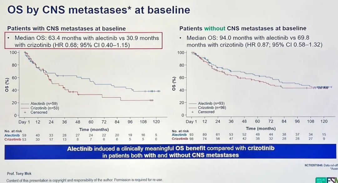 ALEX试验:基线有/无CNS转移患者的OS