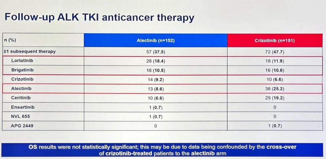 两组总生存期差异未达统计学显著性的主要原因有二:首先,试验允许克唑替尼组患者在进展后交叉换用阿来替尼,这种治疗交叉混杂了最终的生存数据分析;其次,本研究在设计上本身未将总生存期设定为主要统计终点。