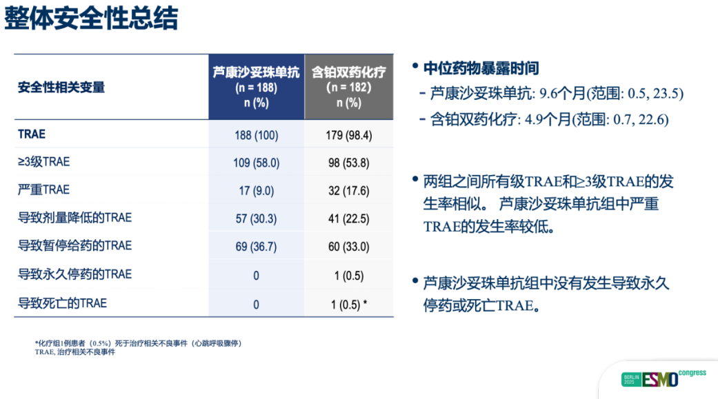其次在安全性方面,芦康沙妥珠单抗做到了“增效减毒”,虽然研究中两组的≥3级治疗相关不良事件(TRAEs)发生率接近(58.0%/53.8%),但芦康沙妥珠单抗组严重TRAEs的发生率仅为9%,较化疗组的17.6%更低,且未报告对患者生存有明显不利影响的间质性肺病(ILD),常见TRAEs如贫血、口腔黏膜炎等通过支持治疗均可有效管理,可显著改善患者的治疗耐受。
