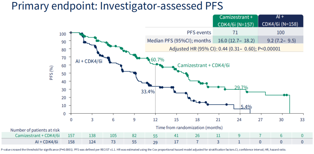 王树森教授:SERENA-6是首个采用ctDNA指导内分泌治疗转换Ⅲ期临床试验,评估了ER+/HER2-晚期乳腺癌患者在检测到ESR1突变且尚未出现临床或影像学疾病进展时,将CDK4/6抑制剂(哌柏西利、阿贝西利或瑞波西利)联合的内分泌治疗方案从AI转换为Camizestrant的疗效与安全性[6]。2025 ASCO大会上已公布SERENA-6研究的主要结果,提示Camizestrant组的中位无进展生存期(PFS)显著优于AI组(16.0个月vs 9.2个月;HR=0.44;P<0.00001),展现了这一创新策略以及Camizestrant+CDK4/6抑制剂一线治疗的临床应用价值[6]